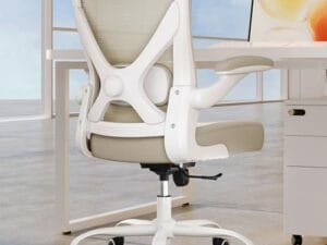 Silla para escritorio ergonómica con soporte lumbar ajustable. Color beige y blanco