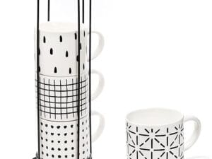 Set de 4 tazas para café o té de 15 onzas (color diseños blanco y negro) con organizador. Seguro para uso en microondas