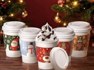 Vasos de café desechable con tapa y funda para proteger del calor. 12 onzas. Vasos decorados de Navidad. Pqte 50 vasos