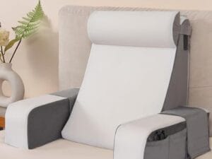 Almohada de espalda para leer sentado en la cama. Color blanco y gris