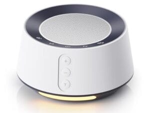 Máquina de ruido blanco (white noise) con 20 sonidos relajantes para dormir (sonido de lluvia, olas del mar, pájaros, entre otros) y con luz nocturna. Color blanco
