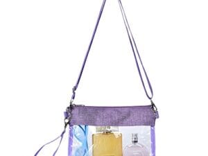 Cartera plástica transparente (clear) con correa (crossbody) para los días del examen. Tamaño aprobado para estadios y conciertos. Tamaño 9.8 x 7.6 pulgadas. Color púrpura (violeta)