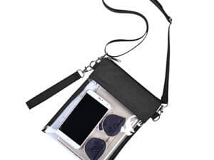 Cartera plástica transparente (clear) con correa (crossbody) para los días del examen. Tamaño aprobado para estadios y conciertos. Tamaño 9.8 x 7.6 pulgadas. Color negro