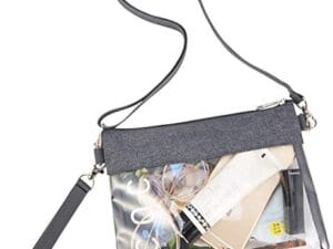 Cartera plástica transparente (clear) con correa (crossbody) para los días del examen. Tamaño aprobado para estadios y conciertos. Tamaño 9.8 x 7.6 pulgadas. Color gris