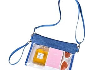 Cartera plástica transparente (clear) con correa (crossbody) para los días del examen. Tamaño aprobado para estadios y conciertos. Tamaño 9.8 x 7.6 pulgadas. Color azul