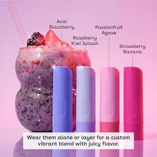 FRUITY SUNRISE SMOOTHIE: Disfruta de los sabores de bálsamo labial eos inspirados en la bebida, incluyendo Acai Blackberry, Raspberry Kiwi Splash, Passionfruit Agave y Fresa Banana. Hecho para ser en capas para crear bebidas personalizadas