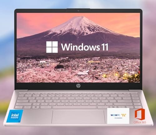 Laptop Hewlett Packard—Pantalla de 14 pulgadas. Modelo Ultrabook. CPU Intel. 8 GB RAM. Almacenamiento de 1.6 TB (64 GB a bordo con unidad portátil de 512 GB + 1 TB OneDrive). Hasta 12 horas de duración de la batería. Windows 11 Home. Color rosa tranquilo