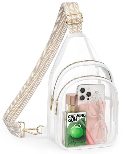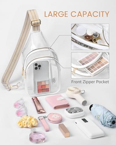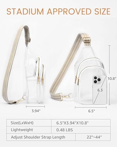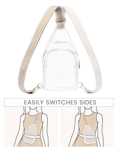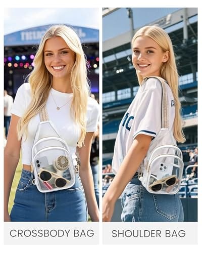 Cartera (tipo mochila) plástica transparente (clear) con correa (crossbody) para los días del examen. Tamaño aprobado de 7.5 pulgadas de largo x 2.8 pulgadas de ancho x 9.0 pulgadas de alto. Color de correa marrón y blanco