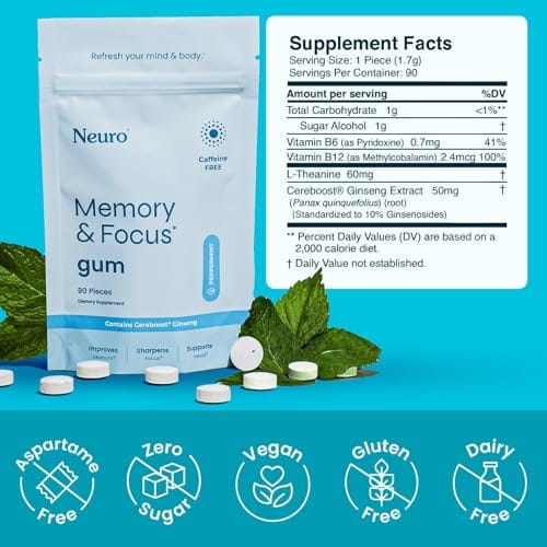 Neuro Memory & Focus Gum (90 piezas) – Sin descafeinado ni azúcar con ginseng americano, L teanina, vitamina B12 y vitamina B6 para el estado de alerta mental, suplementos cerebrales para la memoria y la concentración – Sabor a menta