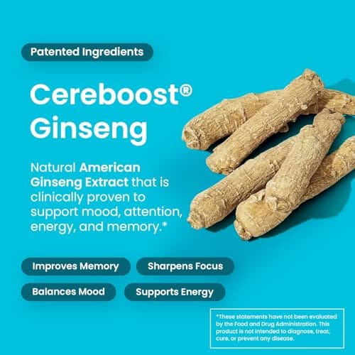 Cereboost American Ginseng: Cada pieza cuenta con extracto de Ginseng Americano Cereboost, conocido por su capacidad para mejorar la función cognitiva y reducir la fatiga mental. Este poderoso ingrediente funciona sinérgicamente con L-teanina y vitaminas para promover la claridad y la concentración durante todo el día.