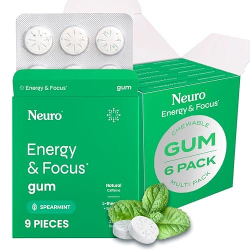 Suplemento (goma de mascar) para el enfoque y la energía. Sabor a menta (Spearmint). Sin azúcar. Con cafeína, L-Teanina, Vitamina B12 & B6. Marca NeuroGum (6 paquetes de 9 piezas)