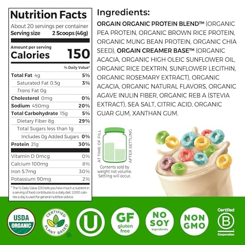 Qué esperar: incluye 1 (2.03 libras) (20 porciones) listo para mezclar Orgain Organic Fruity Cereal Protein Powder. Cada porción contiene 150 calorías (2 cucharadas).