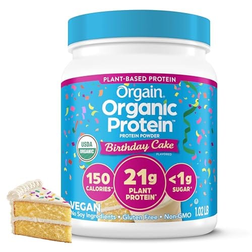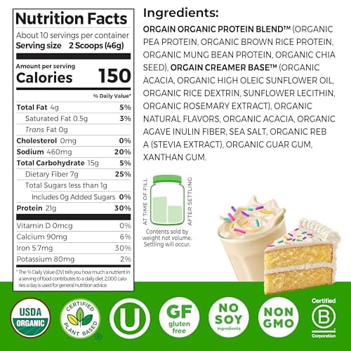 Qué esperar: incluye 1 (1.02 libras) (10 porciones) listas para mezclar Orgain Organic Birthday Cake Protein Powder Cada porción contiene 150 calorías (2 cucharadas)
