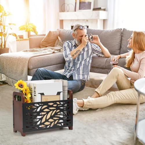 Diseño delicado: soporte para revistas con asas en ambos lados, se puede levantar fácilmente; el diseño de flores ahuecadas hace que sea fácil ver y encontrar cualquier revista o periódico claramente; aspecto vintage de granja, combina bien con la decoración de tu habitación u oficina