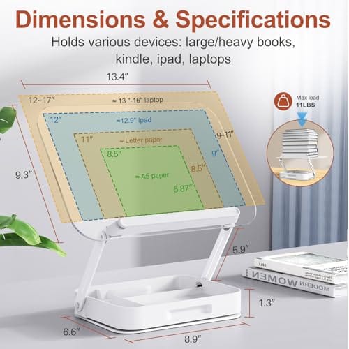 Funcionalidad versátil: soporta de forma estable portátiles de 13 pulgadas, tabletas, libros de cocina o partituras, proporcionando una cómoda experiencia de lectura manos libres. El diseño de 13.4 x 9.3 pulgadas se adapta fácilmente a encimeras de cocina, escritorios, soportes de lectura de cabecera o soportes de partituras, satisfaciendo tus diversas necesidades de uso