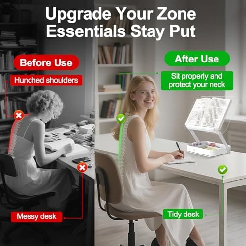 Base ajustable de 360°: el diseño de base giratoria de 360° te permite ajustar el ángulo del libro con facilidad. Ya sea que compartas materiales de lectura con otros, sumergirte en una novela o siguiendo una receta, puedes ajustarlo fácilmente a la posición óptima de visualización, mejorando la claridad y la comodidad, y disfrutando de una experiencia de lectura o trabajo inmersiva