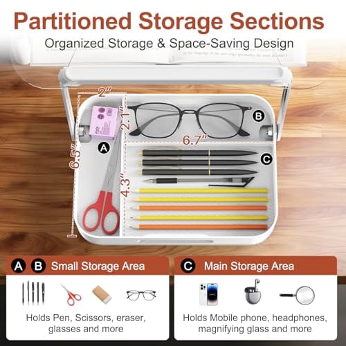 Diseño de la caja de almacenamiento: el diseño multifuncional de la caja de almacenamiento compartimentada le permite almacenar fácilmente gafas, bolígrafos, auriculares y varios artículos pequeños; lo que le permite acceder a ellos en cualquier momento para una experiencia de lectura manos libres sin problemas mientras mantiene un escritorio limpio y organizado