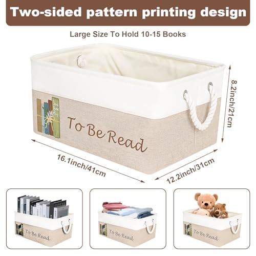 Resistente a la humedad y gran capacidad: nuestra cesta de almacenamiento de libros TBR está hecha de material resistente, adecuado para uso a largo plazo. El tamaño de esta cesta TBR es de 16.1 x 12.2 x 8.2 pulgadas y puede contener de 10 a 15 libros a la vez, lo que te ayuda a organizar tus libros y mantener tus cosas