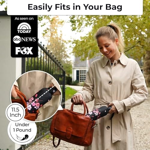 Sombrilla/Paraguas compacta resistente a vientos fuertes, compacto. Pesa menos de 1 libra. Abre y cierra automáticamente al toque del botón. Cabe en mochila. Color negro por fuera, flor de cerezo por dentro. Marca Tumella