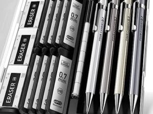 Lápiz mecánico de metal 0.7mm con estuche y gomas de borrar Pqte: 4 lápices